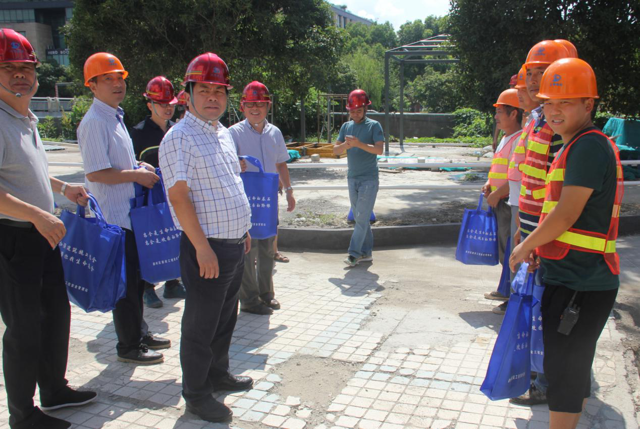2018年8月8日上午,鄞州區(qū)住建局徐寧軍副局長(zhǎng)一行在朱本浩副總經(jīng)理的帶領(lǐng)下,來到嵩江6#地塊質(zhì)量檢測(cè)大樓項(xiàng)目部,為炎炎夏日奮戰(zhàn)在一線的項(xiàng)目施工人員送上慰問,并將事先準(zhǔn)備好的防暑降溫用品送到工人們手中。