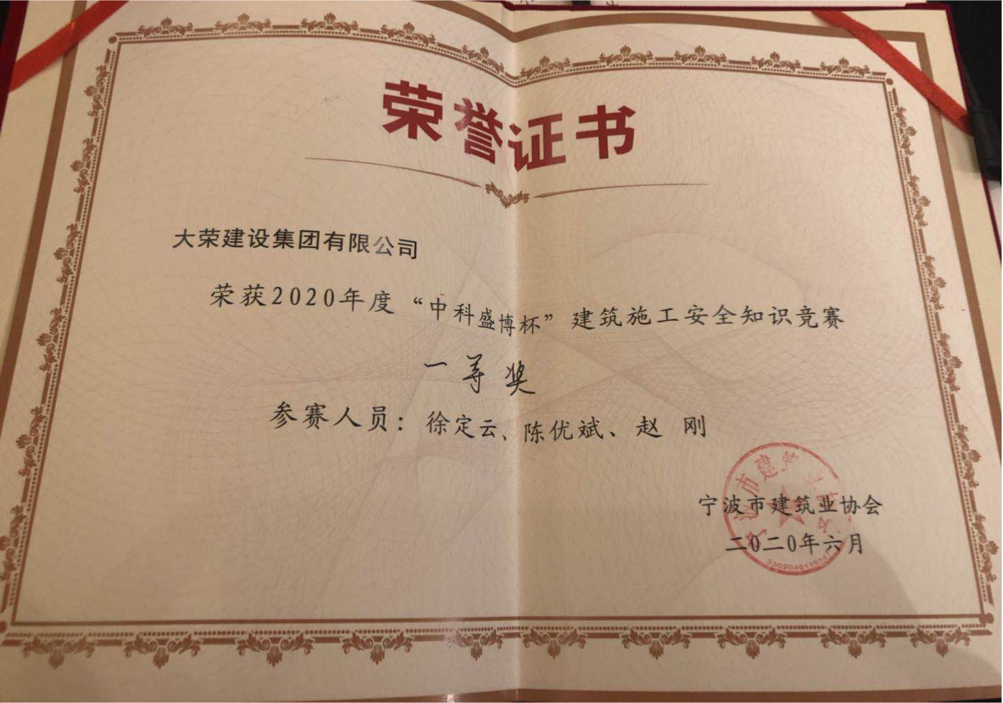 此次競賽共有19個代表隊參賽,每個代表隊3人。經(jīng)過數(shù)輪緊張激烈的比拼,最終,我公司徐定云、陳優(yōu)斌、趙剛?cè)淮聿回摫娡?,憑借過硬的建筑施工安全知識和良好的團隊協(xié)作精神,勇奪2020年“中科盛博杯”建筑施工安全知識競賽一等獎,展示了大榮建設(shè)良好的企業(yè)形象與實力。