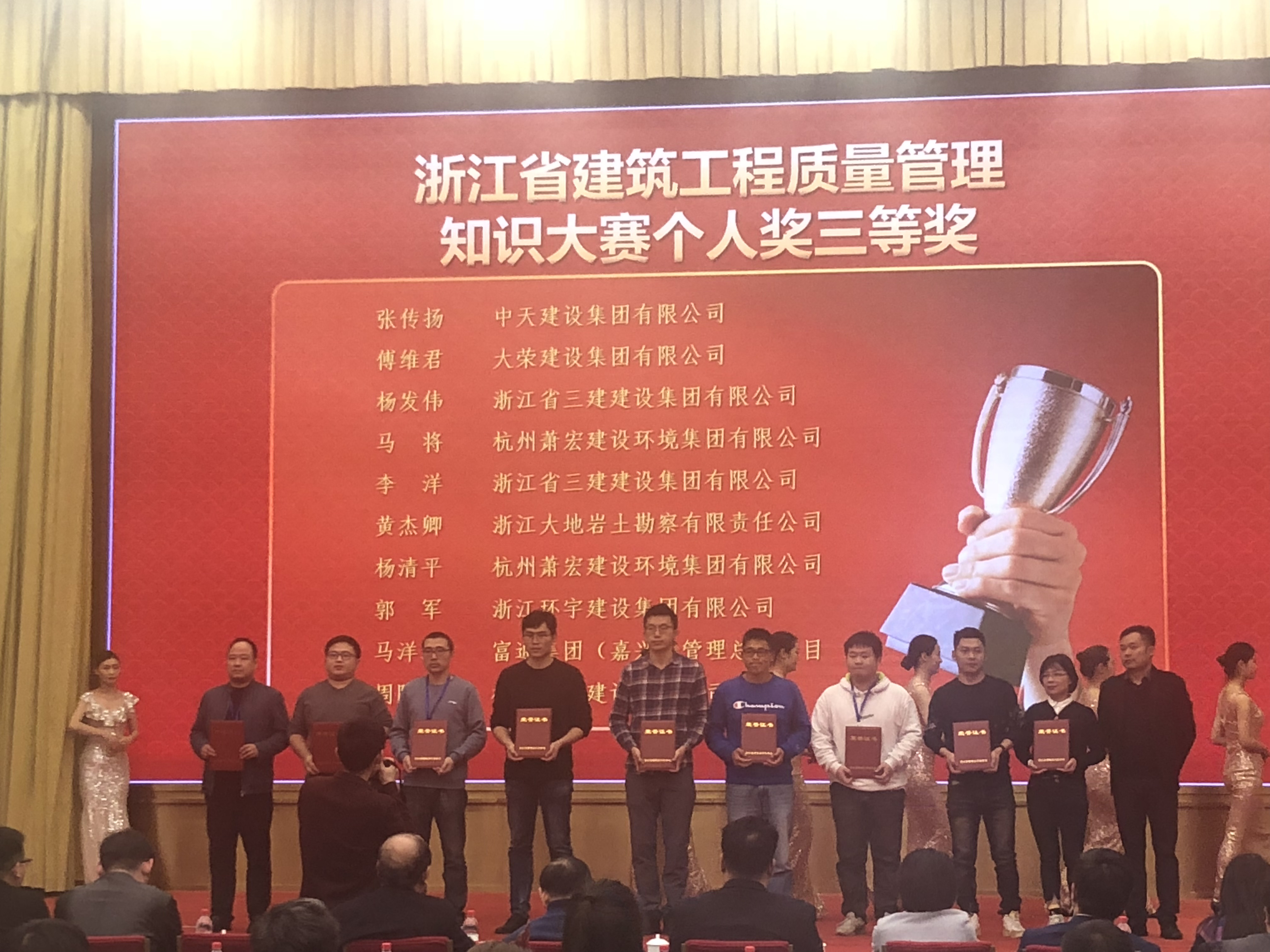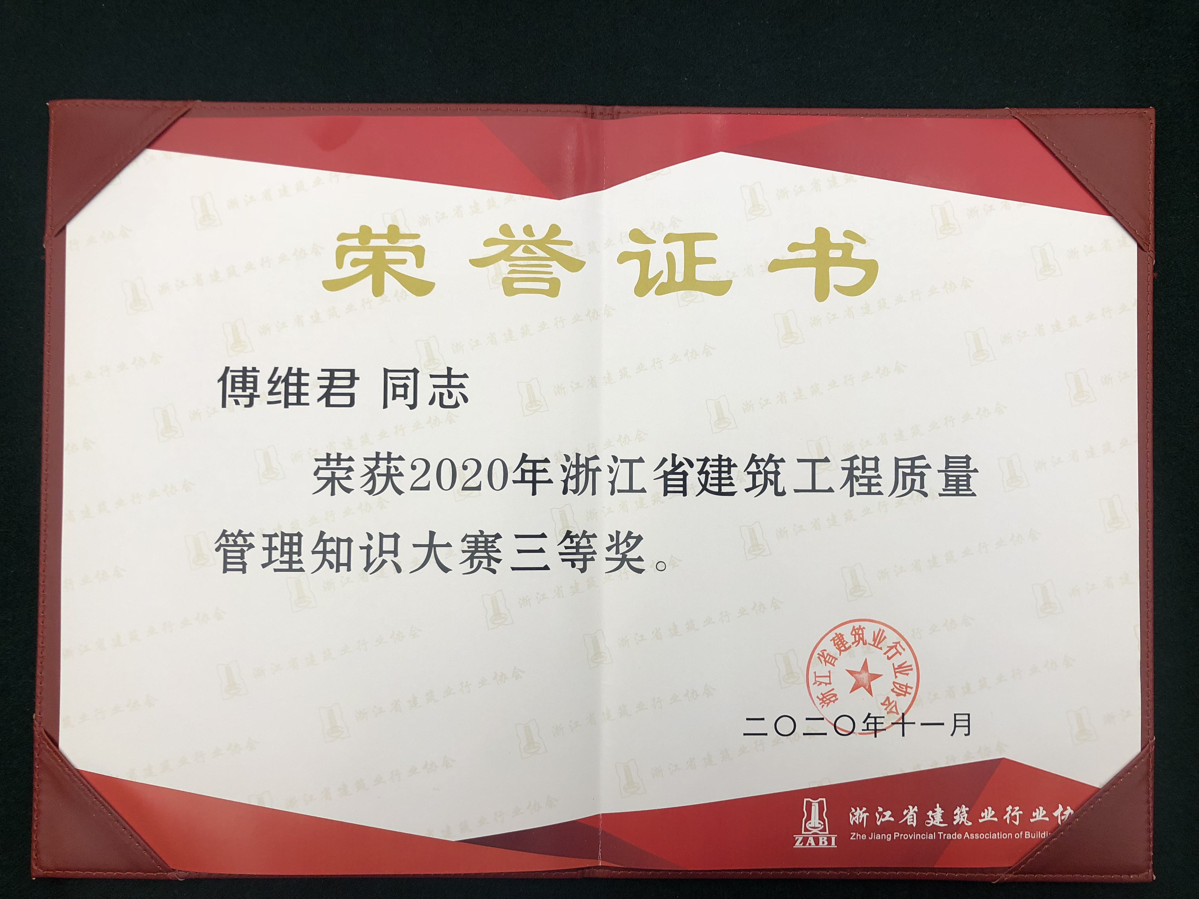 2020年11月25日下午,浙江省建筑工程質(zhì)量管理知識大賽頒獎大會在杭州之江飯店舉行。集團公司榮獲“2020年建筑工程質(zhì)量管理知識大賽最佳組織單位”稱號,工程部傅維君脫穎而出,榮獲個人三等獎。