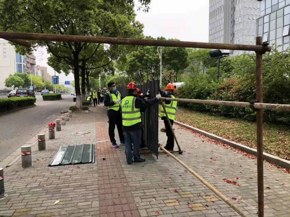 因疫情波及范圍進(jìn)一步擴(kuò)大,按照街道抗疫工作部署,4日12日,抗疫任務(wù)的通知一經(jīng)下達(dá),黨員抗疫應(yīng)急小隊(duì)成員紛紛主動(dòng)請(qǐng)纓,要求到抗疫一線參與任務(wù),“我報(bào)名”,“時(shí)刻準(zhǔn)備著”,“我是黃碼,核酸已做,還能參加任務(wù)嗎?” 其中包括兩鬢微霜的老黨員,壯心不已,迎難而上,也堅(jiān)定地站在疫情防控第一線,這充分展示了黨員的先鋒模范作用!4月13日清晨,黨員抗疫應(yīng)急小分隊(duì)隊(duì)員冒雨集結(jié),趕赴慧和大廈進(jìn)行圍擋搭建工作。在現(xiàn)場(chǎng),公司的兩支應(yīng)急小隊(duì)在雨中有序進(jìn)行接鋼架、加固、設(shè)擋板,以最快的速度,合力完成慧和大廈周邊區(qū)域近900米封擋工作,迅速有效阻斷疫情傳播渠道,筑牢疫情安全防線。