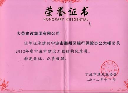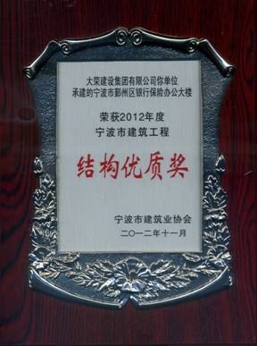 我公司承建的寧波市鄞州區(qū)銀行保險(xiǎn)辦公大樓工程榮獲“2012年度寧波市建筑工程結(jié)構(gòu)優(yōu)質(zhì)獎(jiǎng)”。 | |