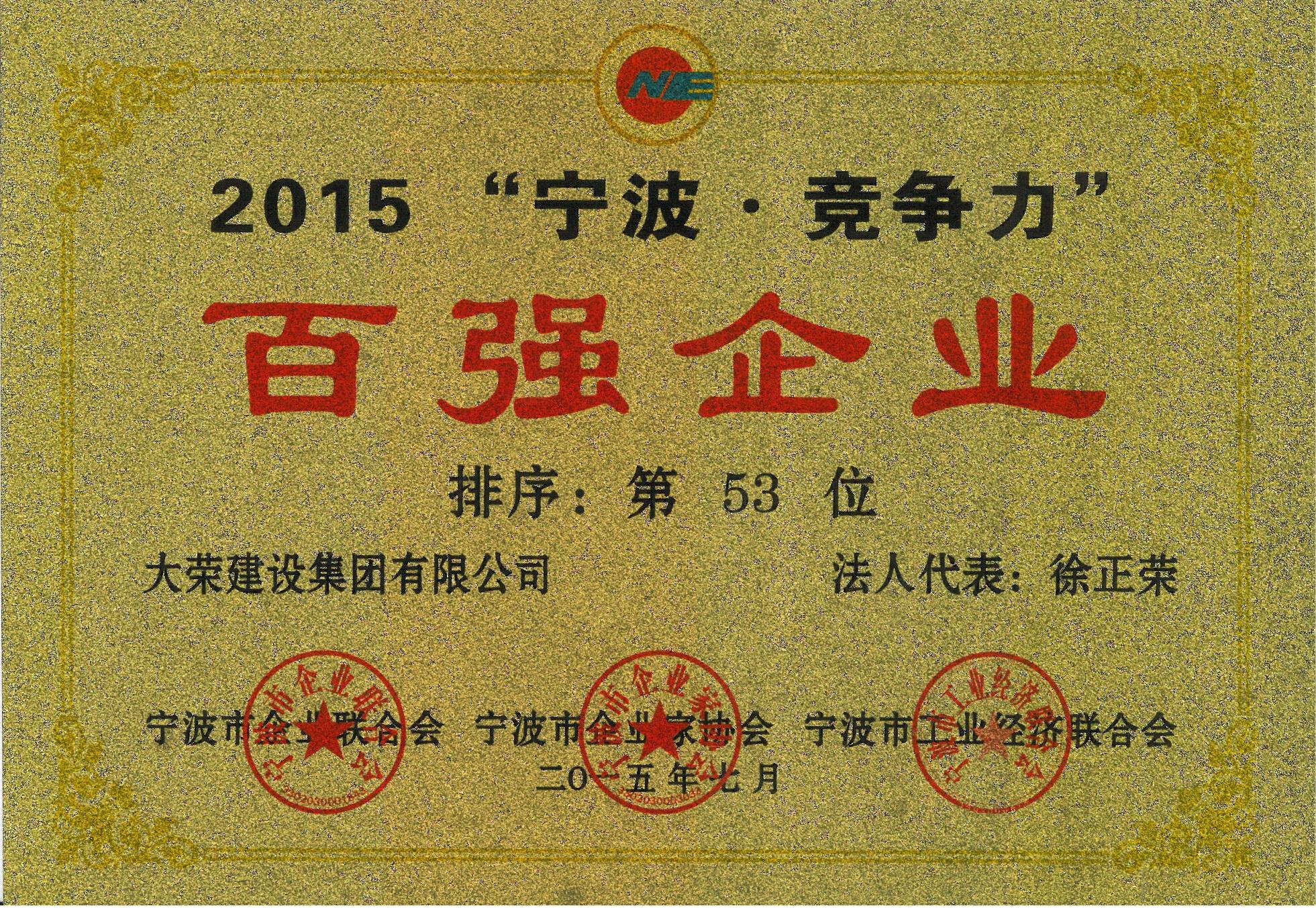 日前,在寧波市企業(yè)聯(lián)合會(huì)、企業(yè)家協(xié)會(huì)和寧波市工業(yè)經(jīng)濟(jì)聯(lián)合會(huì)召開(kāi)的2015寧波市百?gòu)?qiáng)企業(yè)頒獎(jiǎng)大會(huì)上,大榮建設(shè)集團(tuán)有限公司成功入圍2015“寧波·競(jìng)爭(zhēng)力”百?gòu)?qiáng)企業(yè)。