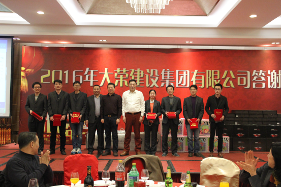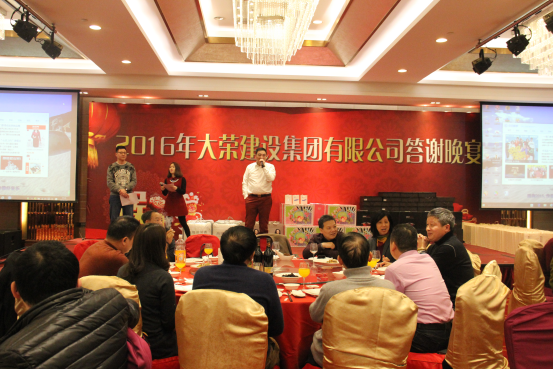 當晚,大榮建設(shè)集團有限公司舉行全體員工答謝晚宴。宴會期間,公司高管領(lǐng)導(dǎo)為優(yōu)秀員工頒發(fā)榮譽證書,為員工抽取各種獎項、分發(fā)獎品,整個晚宴在隆重而不失歡樂的氣氛下進行。